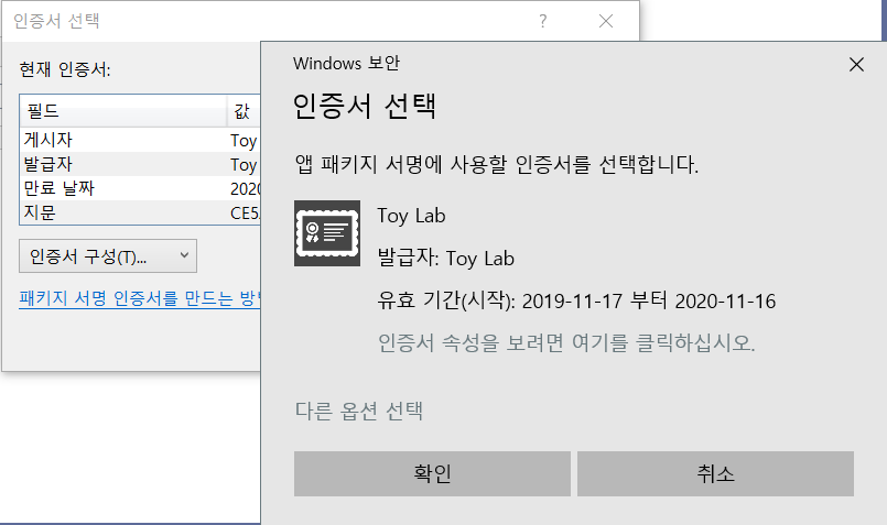패키지 서명용 인증서 만들기 (Microsoft 문서)