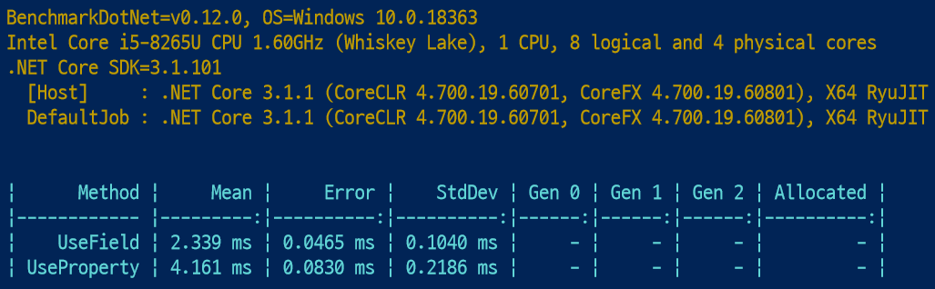 단순 필드를 사용하는 클래스에서는 2.229 ms의 시간이 소요되었고, 프로퍼티를 사용하는 클래스에서는 4.161ms의 시간이 소요되었다. 프로퍼티를 사용하였을 때가 80% 정도 더 많은 시간이 소요되었다. 이를 볼 때 특별한 이유 없이 get, set 메서드를 통해 접근하는 것이 무의미하다고 주장할 수도 있을 것이다. 하지만 100만 번 작업에서 약 2ms만큼 차이 난 것이기에, 그보다 훨씬 많은 작업이 프로그램에서 일어나는 것이 아니라면, 유의미하다고 할 만큼 큰 성능 차이는 없는 거로 보인다.