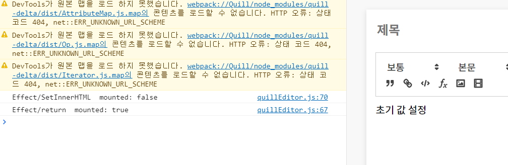 위 문제를 해결하기 위해서는, 초기 값이 빈 문자열이어도 mounted가 true가 되도록 수정해주면 되었다. 하지만 해당 useEffect를 유지하기 보다는 없애버리고, 똑같은 기능을 하는 코드로 간소화하였다. 해당 함수의 역할은 초기 값을 불러오는 것 뿐이었기에, 위의 코드와 같이 Quill 인스턴스를 만드는 useEffect에서 처음에 contents가 있으면 innerHTML을 설정해주도록 하는 세 줄의 코드를 넣어준 것이다.