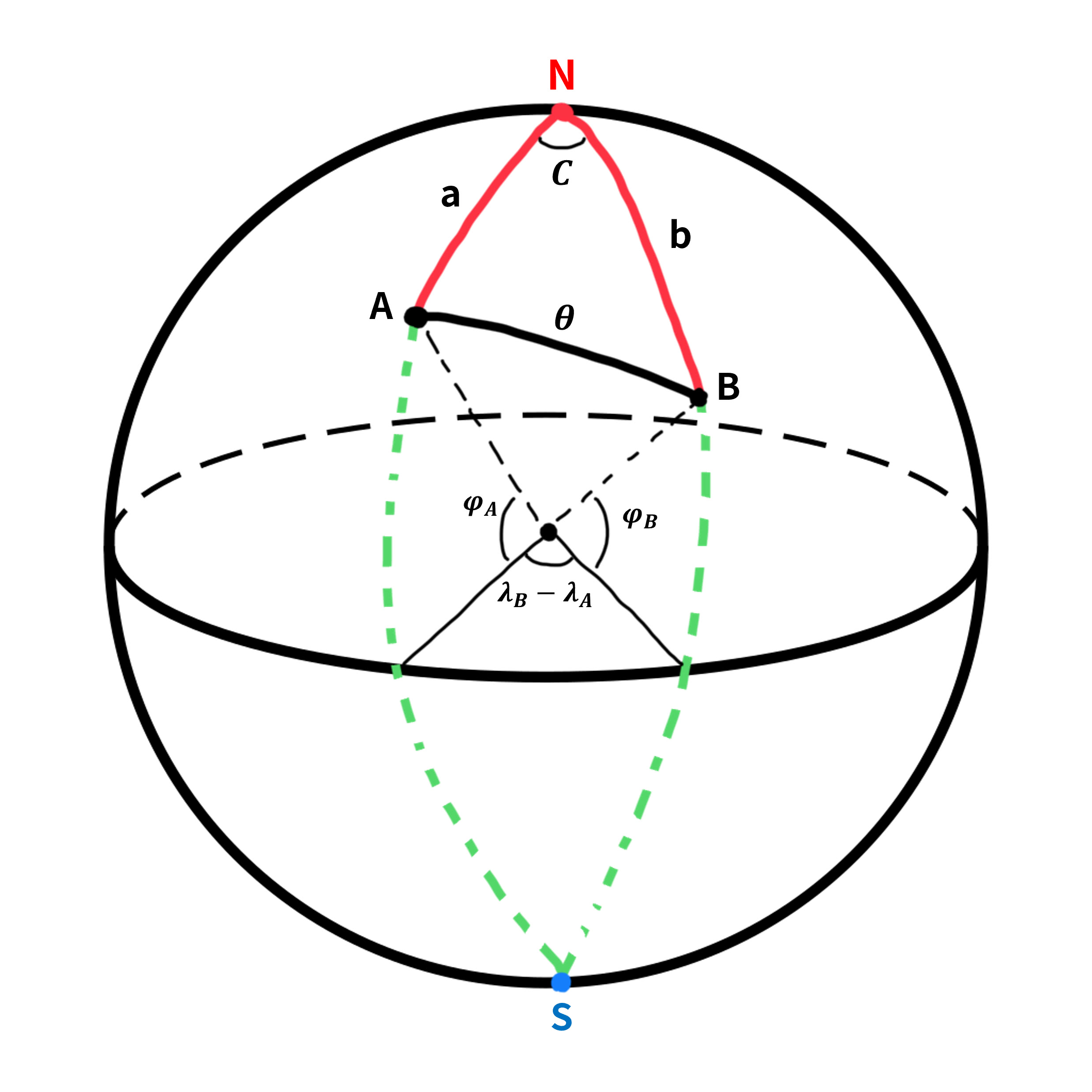 다시 말하지만 구의 반지름을 1 이라고 가정하면, 부채꼴의 중심각과 호의 길이가 같다. 그러므로 점 A의 위도 $\varphi_A$에 대해 $a=\frac{\pi}{2}-\varphi_A$이고 점 B의 위도 $\varphi_B$에 대해 $b=\frac{\pi}{2}-\varphi_B$이다. 또, 두 점의 경도 $\lambda_A$, $\lambda_B$애 대해 $C=\lambda_B-\lambda_A$와 같다. 이를 구면 코사인 법칙에 대입하면 아래와 같다.