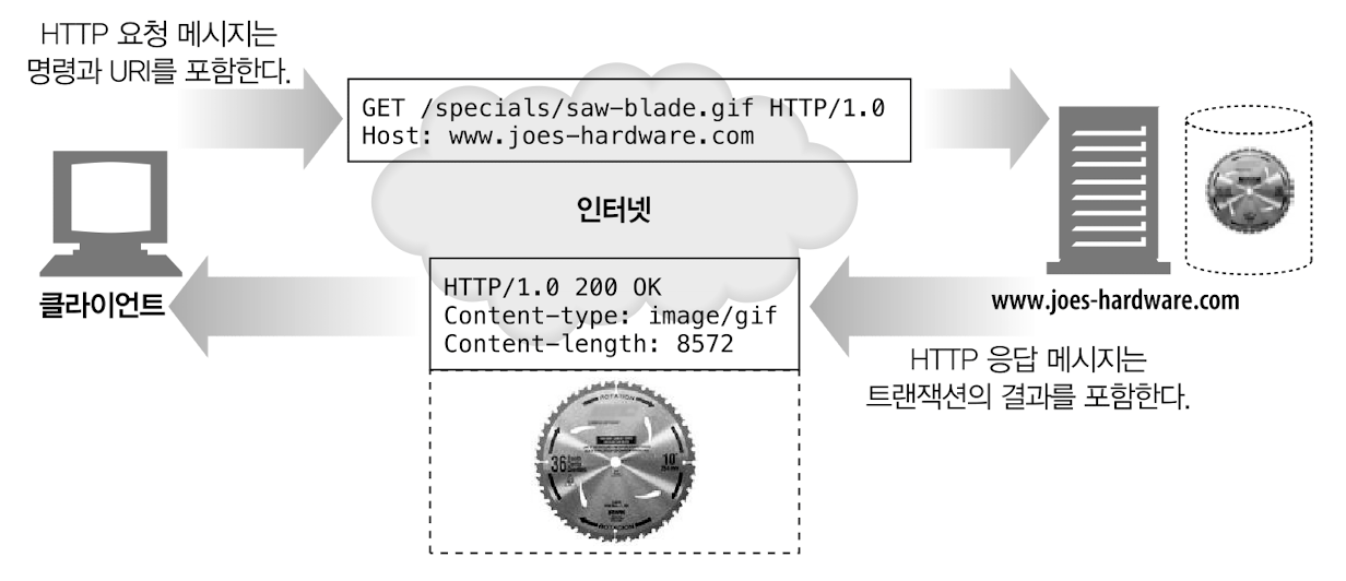 HTTP 트랜잭션은 요청 명령(클라이언트→서버)와 응답 결과(서버→클라이언트)로 구성된다.