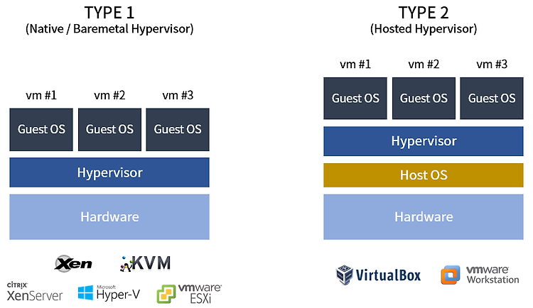 - 타입 1 하이퍼바이저 : 물리시스템 하드웨어에 직접 설치되어 실행되고 가상머신을 관리한다. 베어 메탈 하이퍼바이저라고도 한다. (예시 : Xen, KVM, Microsoft Hyper-V, VMWare ESX/ESXi)