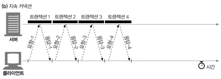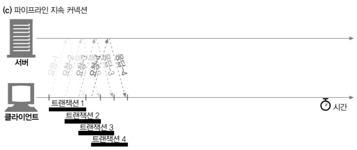 - 지속 커넥션 : 커넥션을 맺고 끊는 데서 발생하는 지연 제거를 위해 TCP 커넥션 재활용