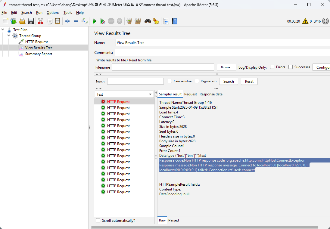 - 16개 요청시, 1개 요청 실패, 15개 성공 (소요시간 약 20초) = 1개 요청은 스레드 풀 대기 큐에 대기하지 못하고 실패
