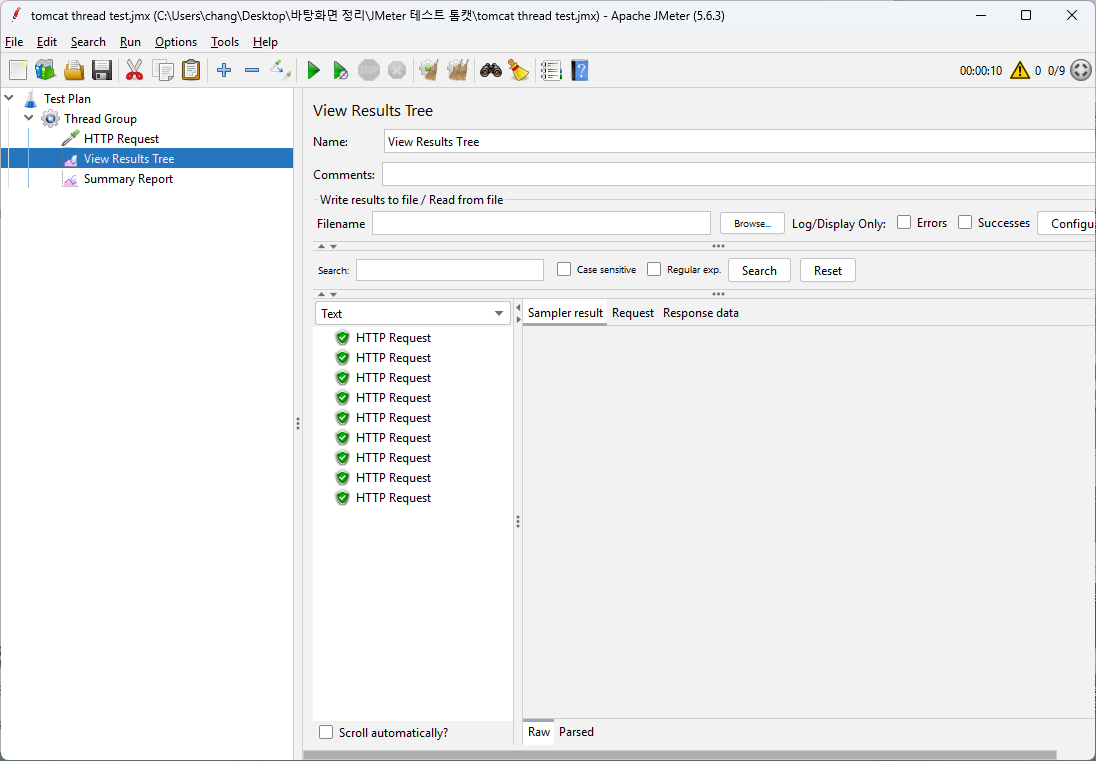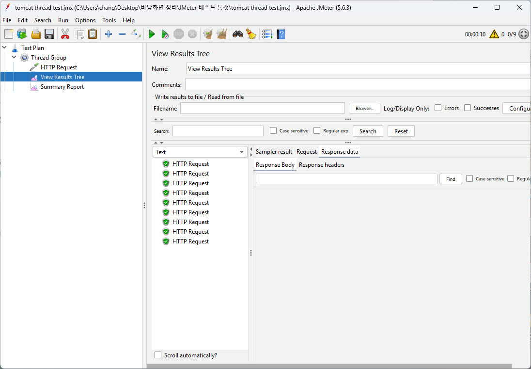 실제 위 설정들이 효과있는지 테스트해보자. 병목을 쉽게 만들기 위해 스레드 풀과 커넥션 설정 값을 낮게 설정하고, JMeter를 사용하여 요청을 보냈다.
