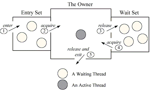 락이 가용하면 호출 스레드는 락의 소유자가 되어 메서드를 실행하며, 종료하면 락이 해제된다. 락이 해제될 때 진입 집합이 비어 있지 않으면, JVM이 집합에서 락 소유자가 될 스레드를 임의로 선택한다. JVM의 구현 방식에 따라 달라지는데 보통 FIFO 방식으로 스레드를 선택한다고 한다.
