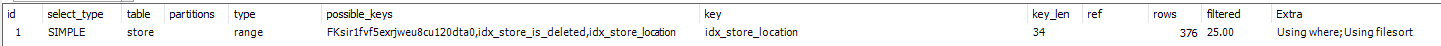 실행 계획을 보면 store_category_id 와 is_deleted 에 대한 인덱스만 사용되고, 그 결과 66만개 행 중 16만 3천개의 행이 조회됩니다.